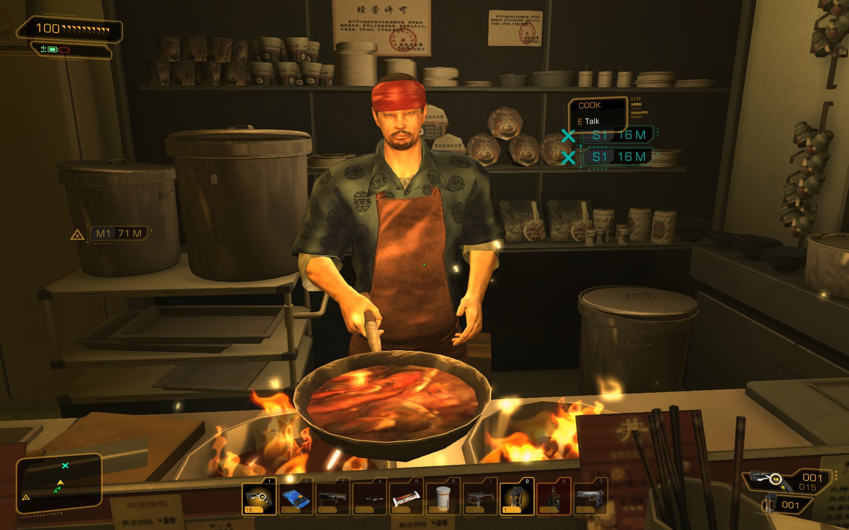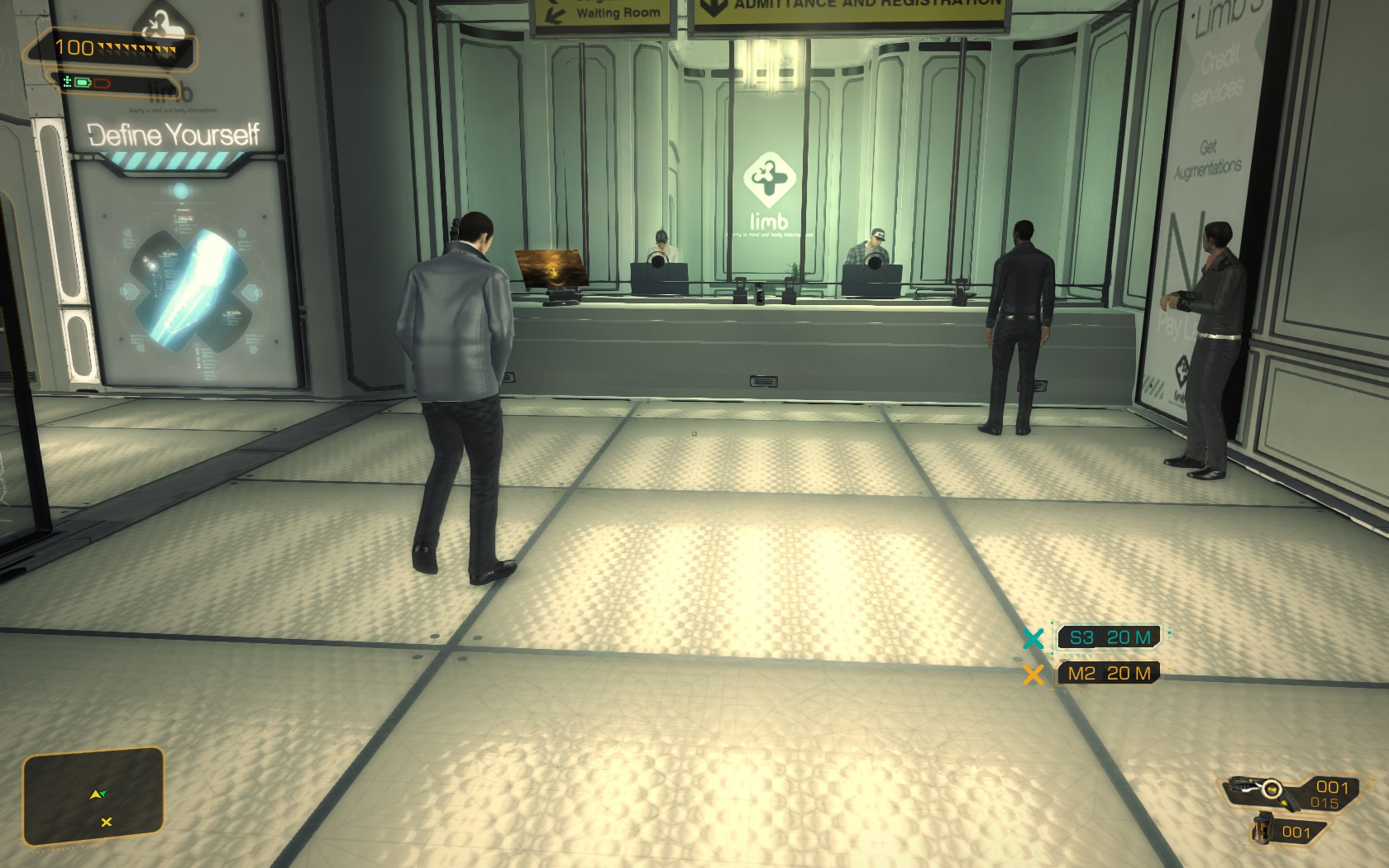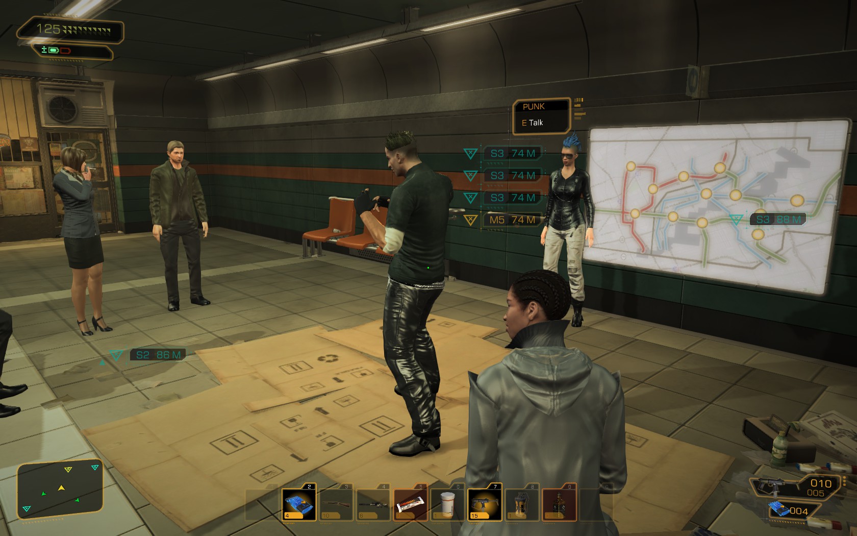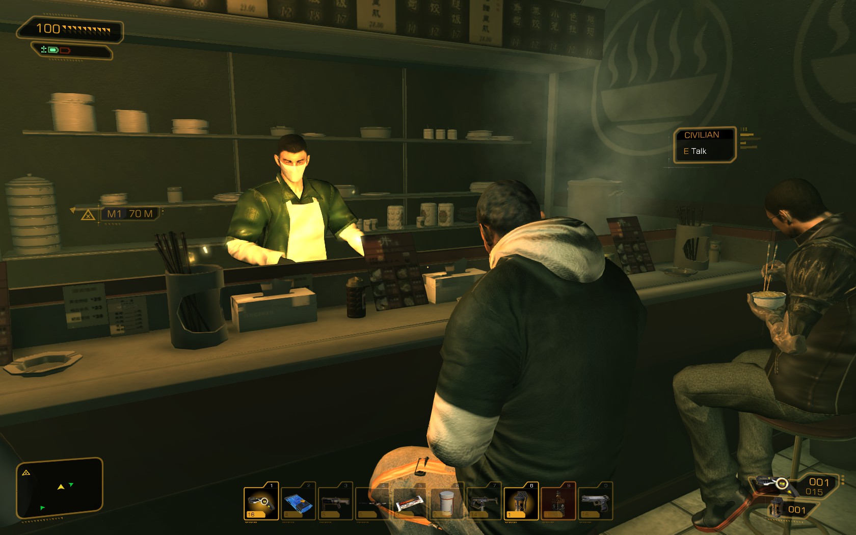 The game is played from a first person perspective for the most part, with the exception of some, for the most part unnecessary cutscenes. This brings up the concept of the Take down system mentioned above. You can incapacitate people by using a non lethal take down (basically walking up to someone and pressing a key). This will take care of enemies without having to kill them, and can be a good solution to many situations. I think you can actually play through the entire game without actually killing someone with a few exceptions. This brings me to the most annoying part of the game: Boss fights. From what I’ve heard, the boss fights in this game were outsource to a different company and the original developer wasn’t to happy with them, however they are there and I have to talk about them. The first one almost made me stop playing the game, cause I got there with weapons that made it really difficult and these fights only take away from the overall experience of the game. They are few and far between however, so, for the most part, those shouldn’t bother anyone to much. This game, however isn’t only about killing stuff. The main story and the multi layer quests is better then you’ll find in most games. This game calls itself an RPG, and RPG for most people today means statistics, leveling and character development (even though this can be debated and I don’t agree with it). You gain experience by doing all sorts of things; Talking to people, completing quests, hacking computers and taking out enemies). For the most part, you gain more experience by using non lethal solutions to problem, something that can push your gameplay in a way that I don’t like. While playing, I usually don’t care and I just take the solution I feel is the most righteous thing to do or whatever suits me best. In terms of leveling, you gain praxis points that can be used to buy augmentations. Augmentations are basically the skill system of this game. When it comes to weapons, I don’t feel that any weapon is more powerful then another in most cases. Everything has it’s advantages and disadvantages, with the exceptions of the silly boss fights. Same goes for the augmentations, even though I’ve found a few that would be really difficult for me to do without. There’s quite a few weapons to choose from, but I usually use what’s at hand, and what I can find ammo for, since your inventory space is quite limited, even with inventory enhancing augs. I’ll usually find myself switching weapons several times during a long mission depending on what my enemies are using. This will depend on your accuracy and the difficulty level you play on off course. Even though I have been talking a lot about combat and such here, I want to emphasize that the most important part of this game is the storytelling and character interaction.