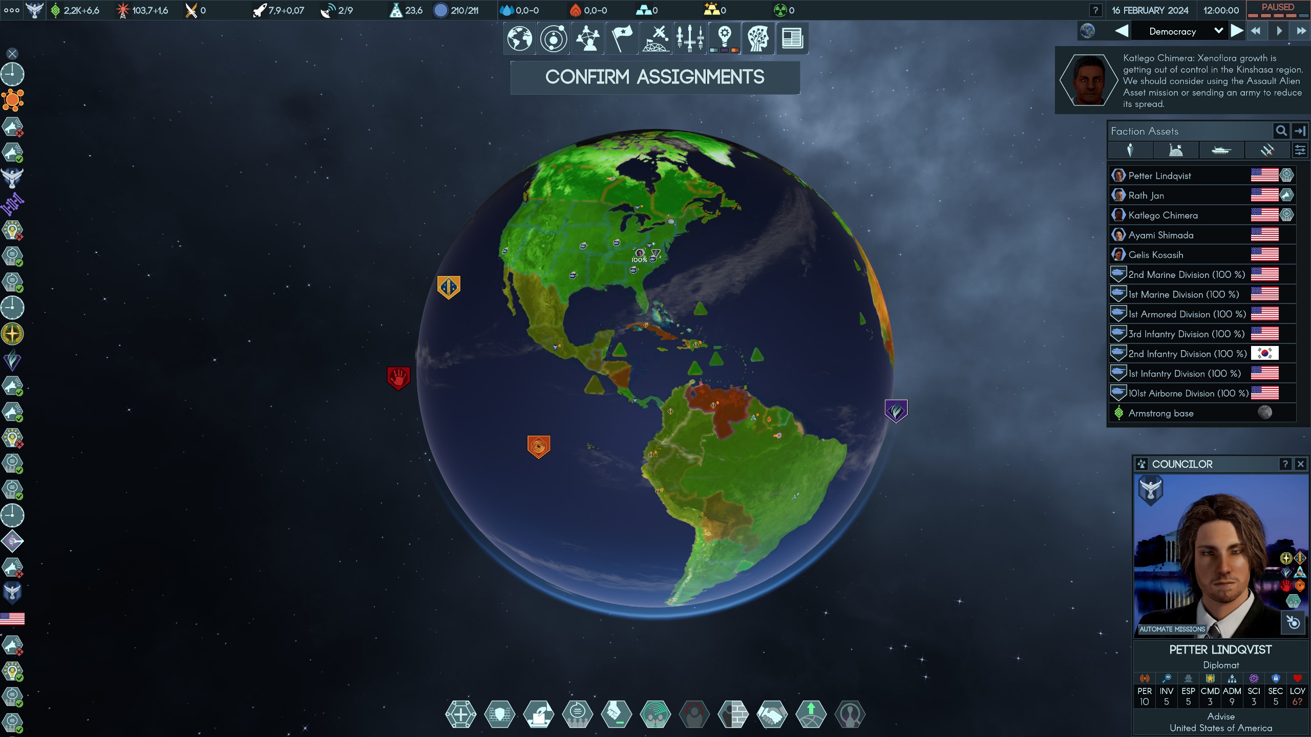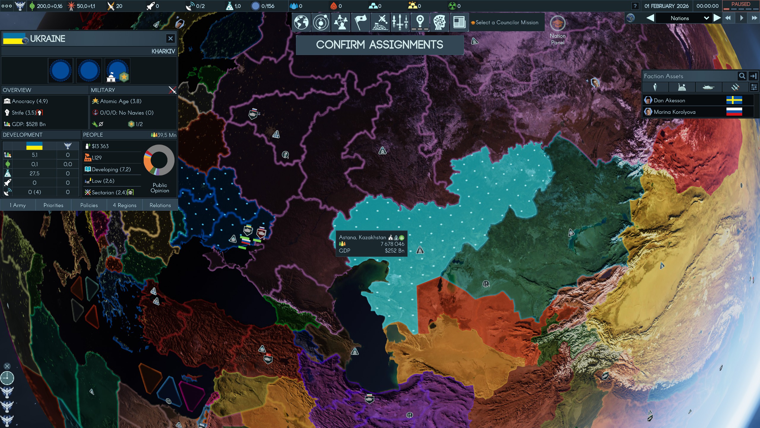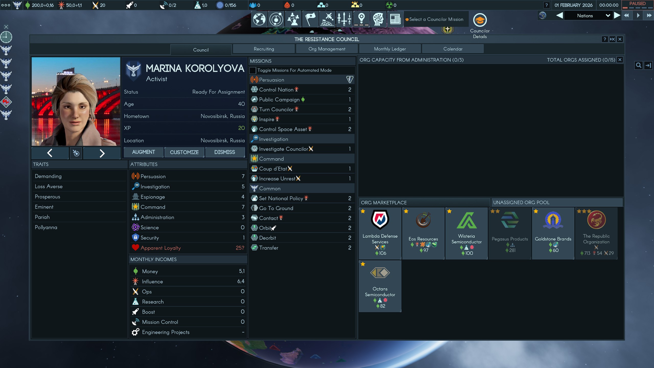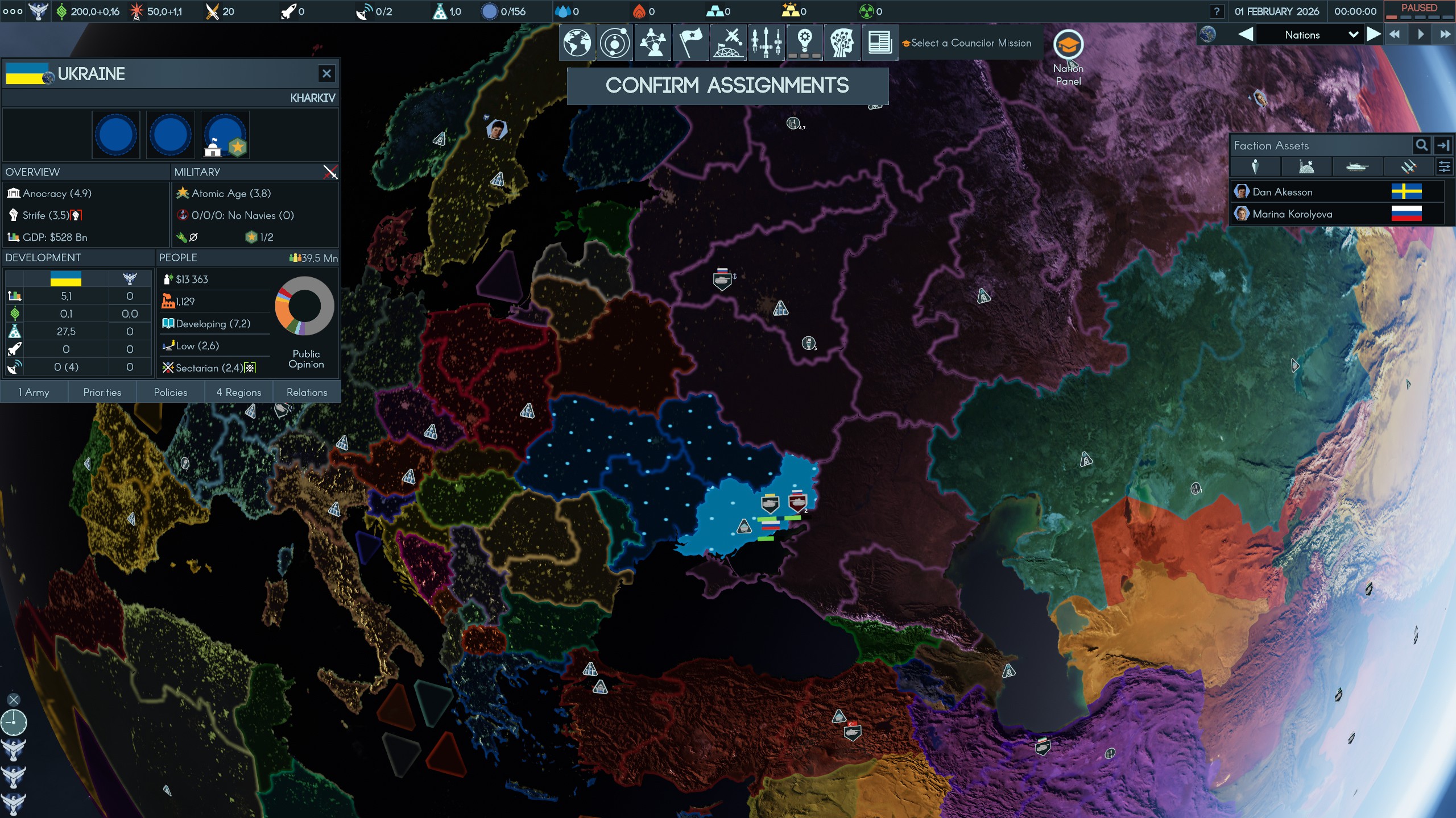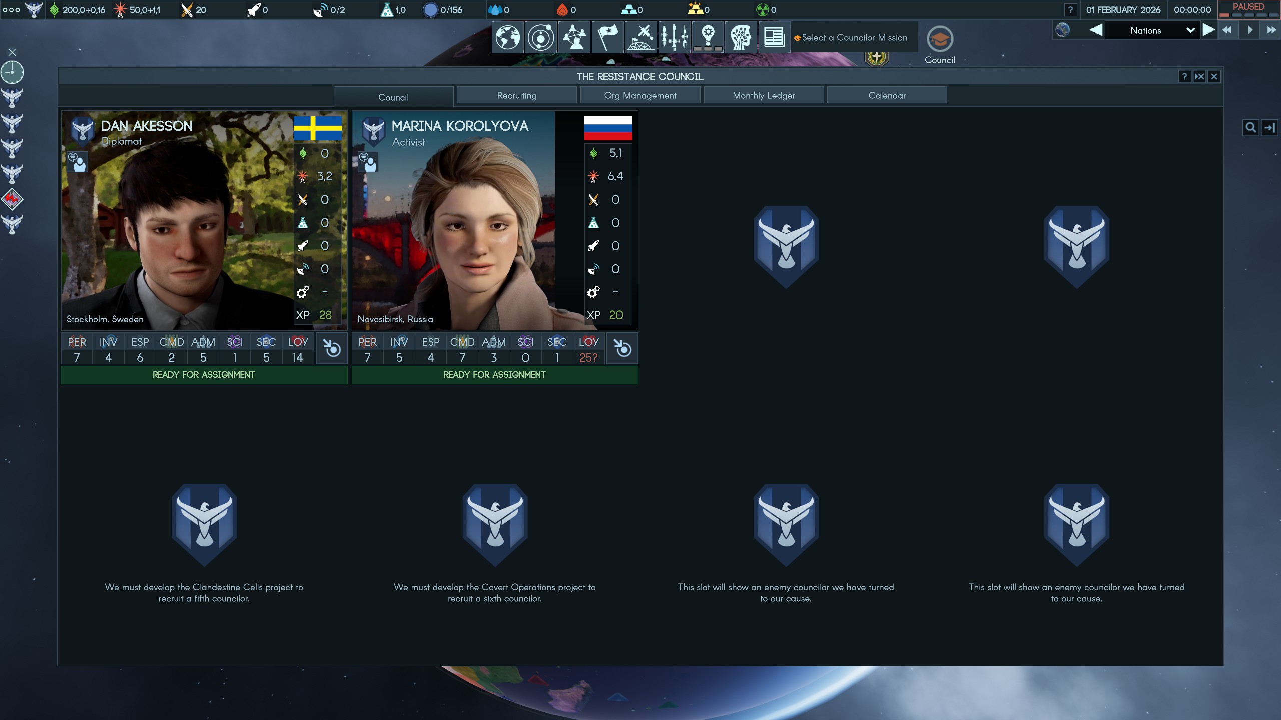 You start the game with control of no countries, so your first goal will be to take control of a few nations to exploit their resources and get access to, or build up their space program. It's up to you how you want to deal with each country you control, you can push them in different directions depending on your goals and needs. To gain control over regions and fight other factions you use agents under your control with different abilities. These can be leveled up, but can also die or retire.