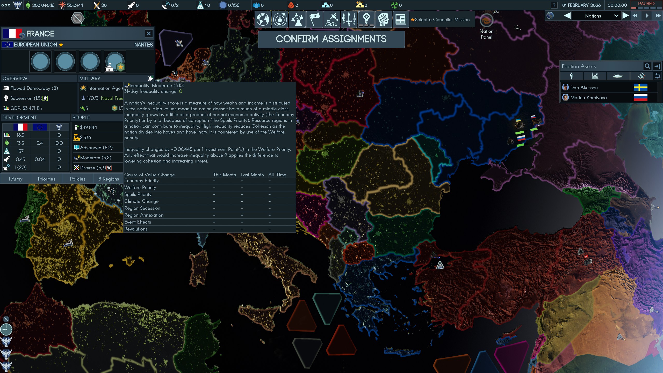 This is one of the most ambitious games I've ever played. It's trying to do a lot of things. Every region has GDP and a lot of the geopolitics are simulated. Also, a lot, if not most of the solar system is simulated. This is hard sci-fi with a lot of space physics simulated from my understanding. You could argue that this is several games baked into one. First of all you have the game on earth, where factions are struggling to gain control over nations, once you get into space, you have to manage space stations and fight space battles against aliens and possibly other factions.